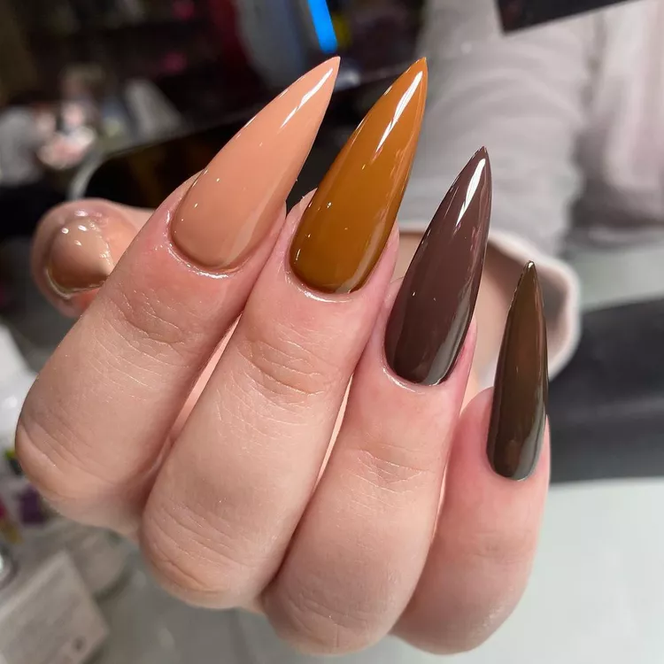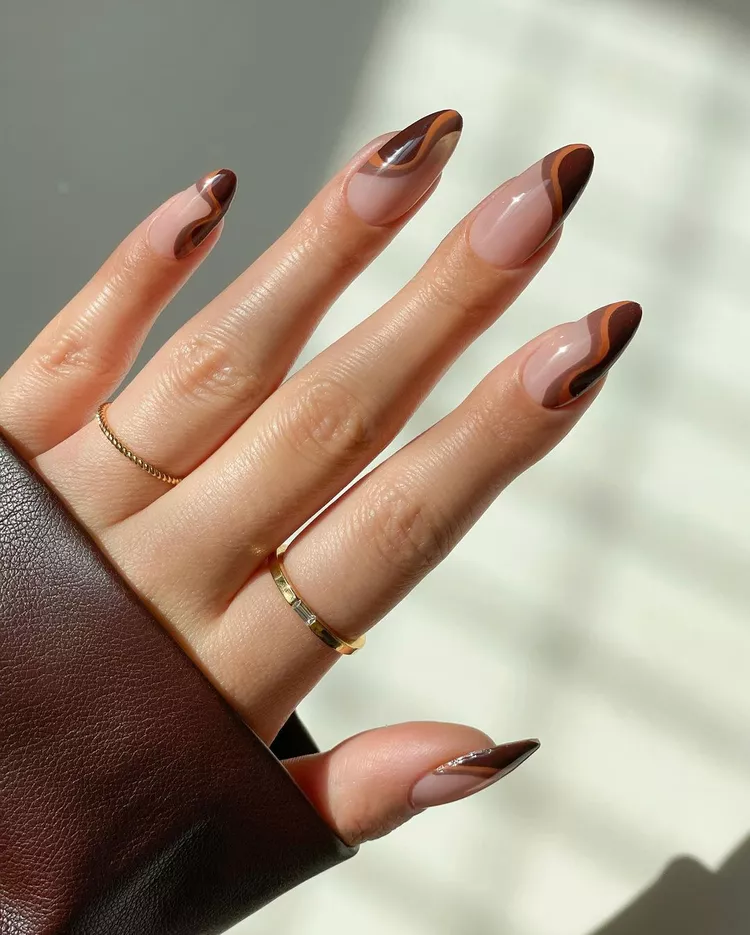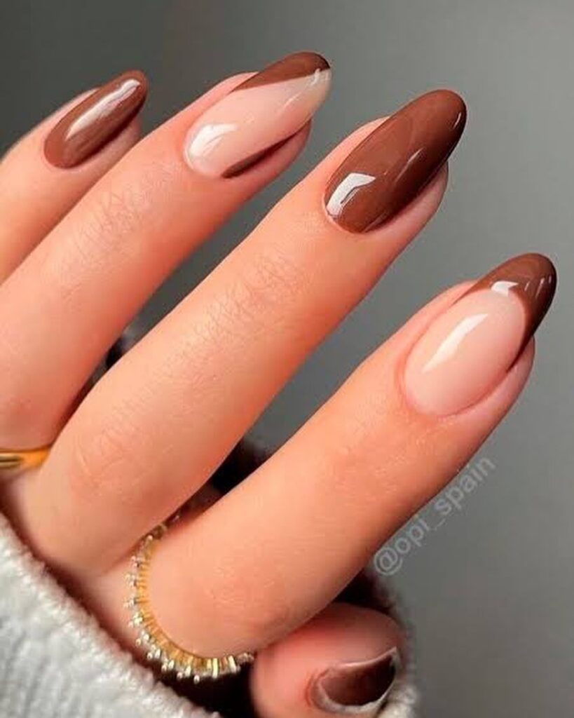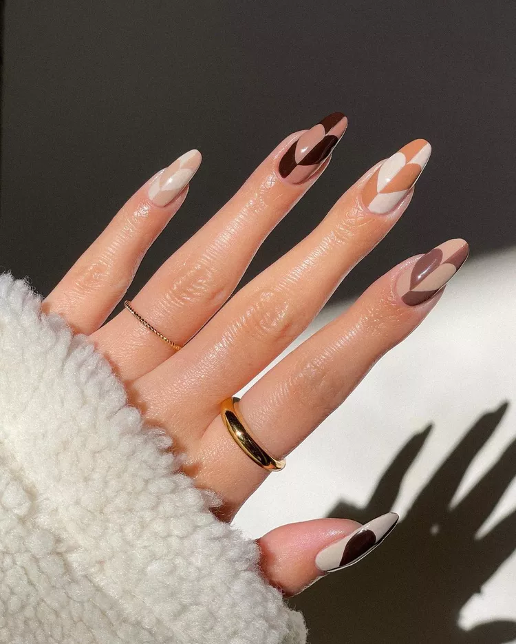 This look combines classic espresso brown with lighter, creamier tones for a modern take on the traditional brown manicure. It’s an elegant way to keep your nails fresh while still embracing the fall season.