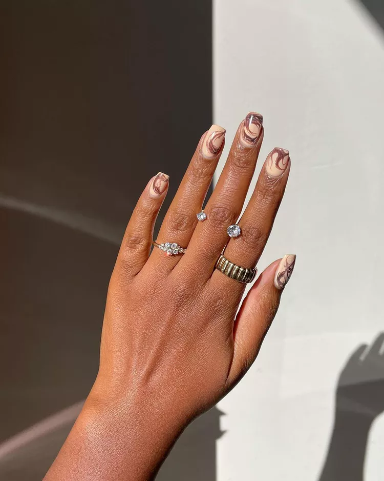 For something truly eye-catching, try a marble coffee design. Start with a soft cream base, then swirl dark brown polish over it to create a marble effect. It’s a unique and artistic way to showcase the espresso brown trend.