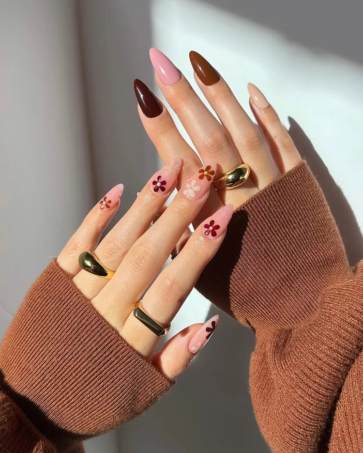 Espresso brown nails are the perfect canvas for delicate fall florals. One hand could feature a beautiful floral design, while the other keeps it simple with a solid espresso ombré. This design strikes a perfect balance between elegance and whimsy.