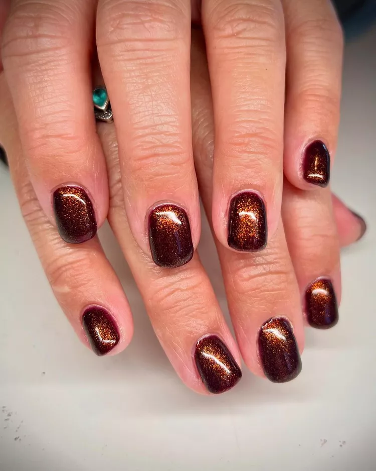 If you’re looking for extra shine, try a bronze glitter polish. The rich glitter adds a bit of sparkle and glamour to your fall manicure, making it perfect for special occasions.