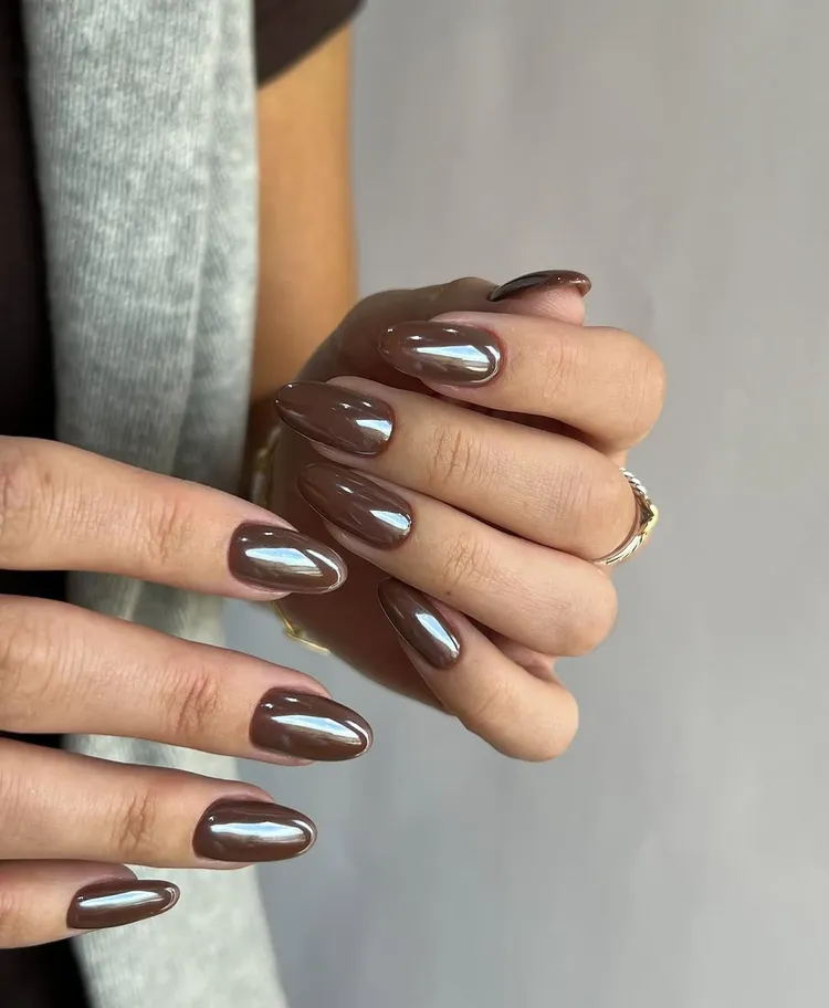 Top off your espresso nails with chrome powder for a frosty, cool-toned look. This adds extra shine and depth, making your nails appear ultra-polished and sophisticated. The chrome finish is perfect for fall and will make your nails the center of attention.