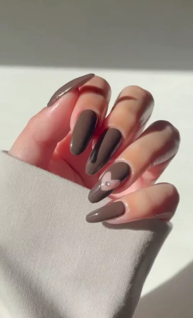 This design features a different brown shade on each nail, from light to dark. A heart shape in the center of each nail adds a charming touch. It’s a playful yet elegant way to wear multiple shades of brown.