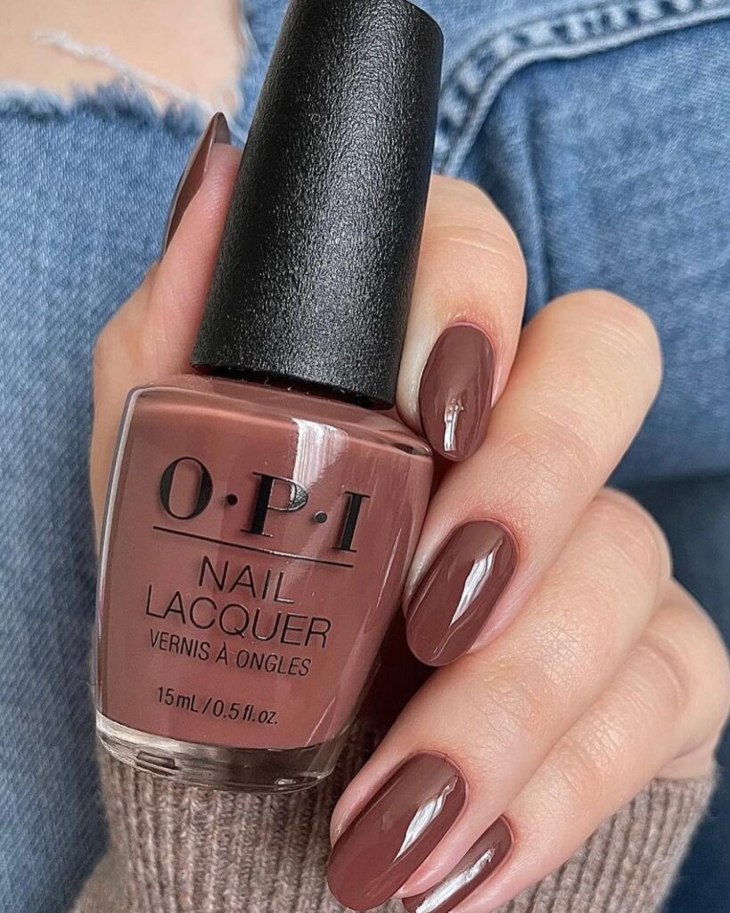 This stunning espresso brown nail polish gives a polished, sleek look with its rich, deep hue. Paired with a glossy finish, it’s perfect for any season, adding warmth and sophistication to your nails. The OPI shade shown here is ideal for those looking to make a subtle yet stylish statement with their manicure.