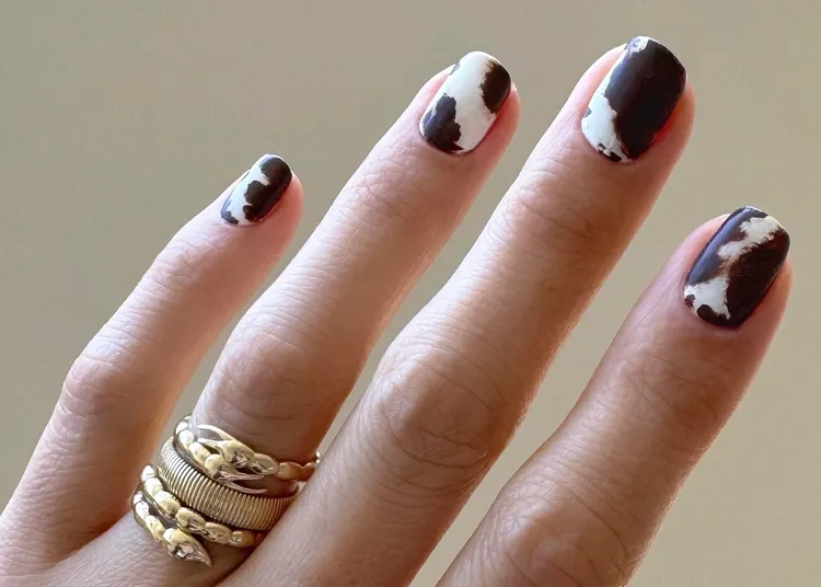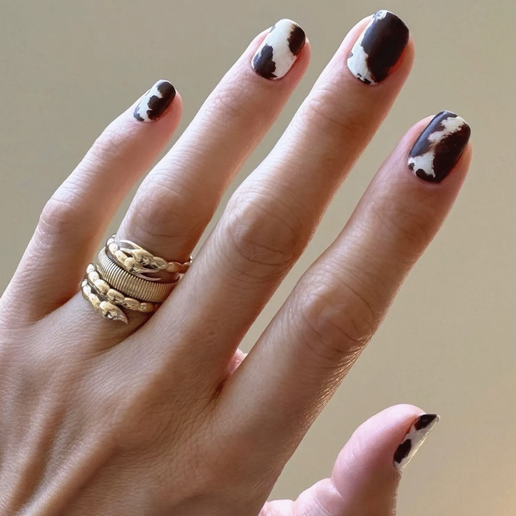 Animal prints are timeless, and the brown cowhide print feels just right for fall. This bold yet simple design adds a trendy touch to short nails. It’s a subtle but chic way to get in the fall spirit without going overboard.