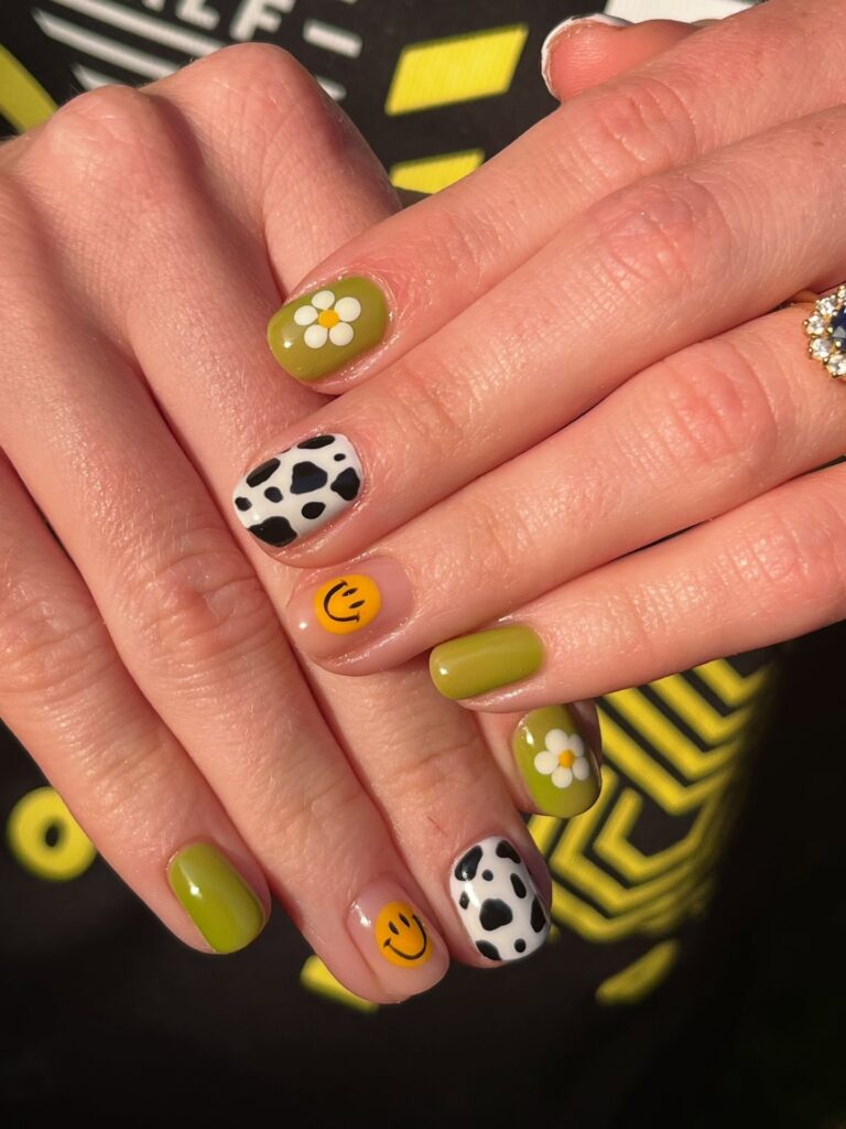 Vibrant and playful nail design combines cheerful green tones with cute and quirky details. Featuring a mix of smiley faces, a daisy flower, and cow print, these nails are full of personality. The pops of yellow and white bring an energetic and fresh vibe, making it a perfect choice for a fun, sunny look!