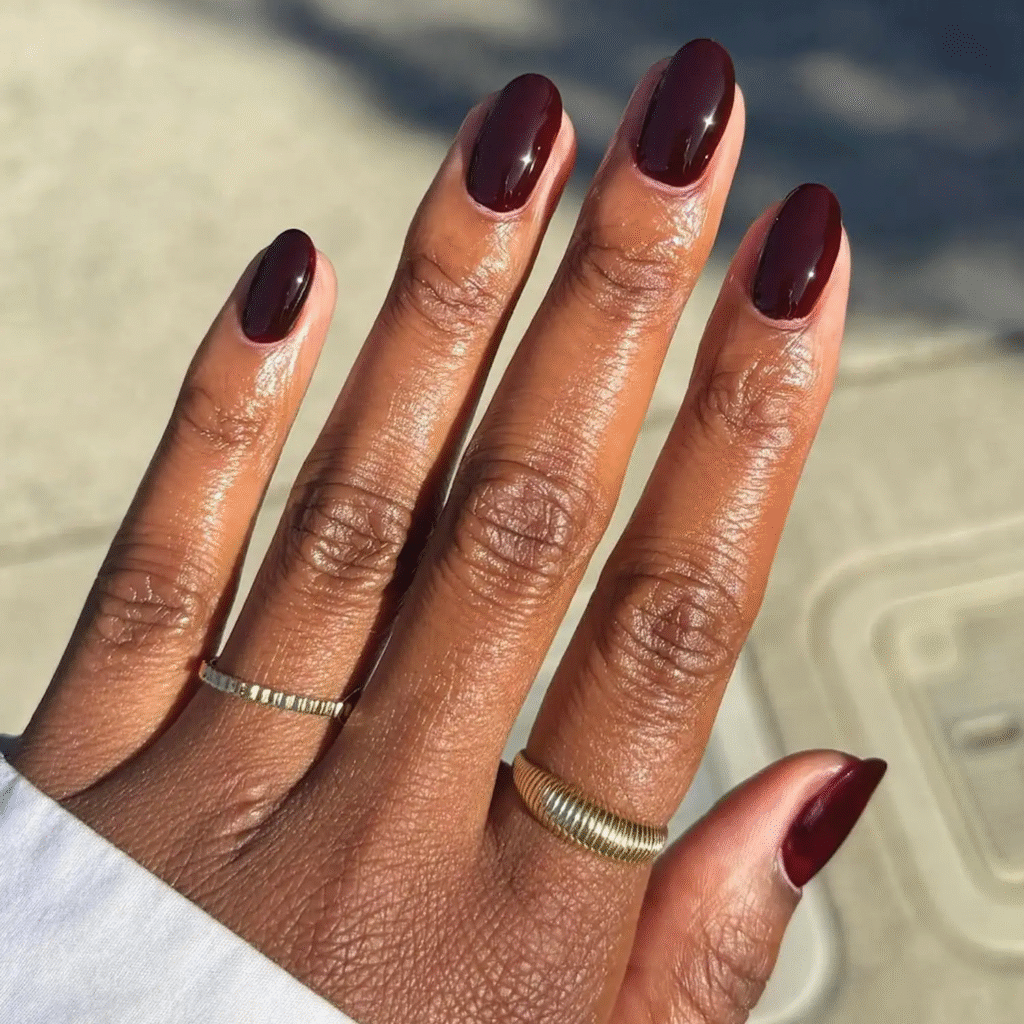 Dark red nails are a staple for fall. Whether you prefer oxblood, burgundy, or deep wine shades, these colors are ideal for setting the fall mood. Picture yourself with a cup of warm apple cider and these deep red nails—pure fall bliss.