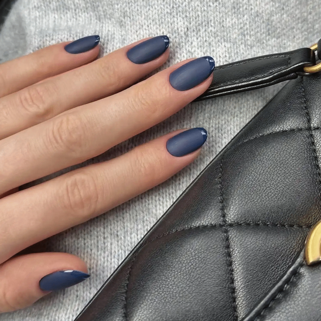 Who says French manicures can’t be fun for fall? Try this twist on the classic French tip by using navy blue. Apply a matte top coat on the base and a glossy finish on the tips for a trendy, textural look that works perfectly on short nails.