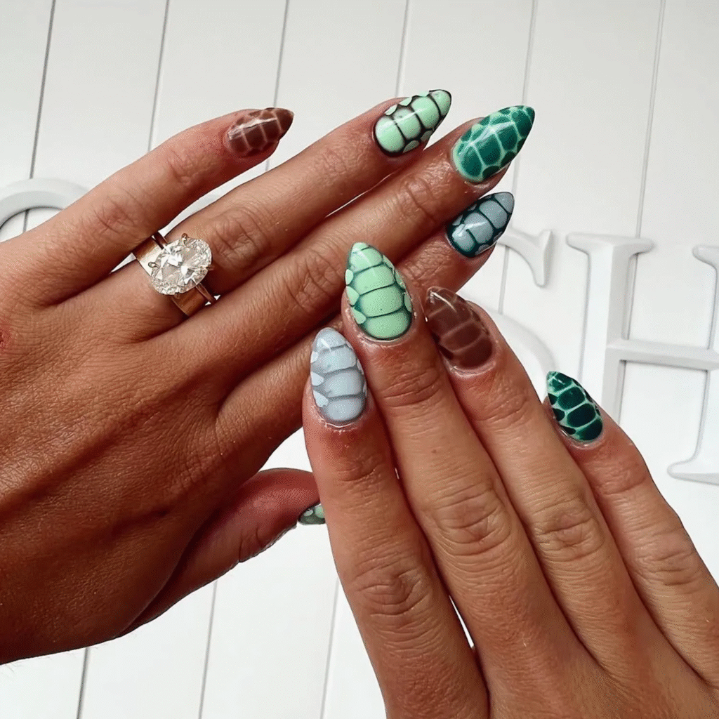 Snakeskin print is having a moment this season, and it looks stunning on short nails. This design mixes fall colors with a touch of fierceness. If you’re into stiletto nails but prefer a shorter length, this snakeskin look is a great choice.