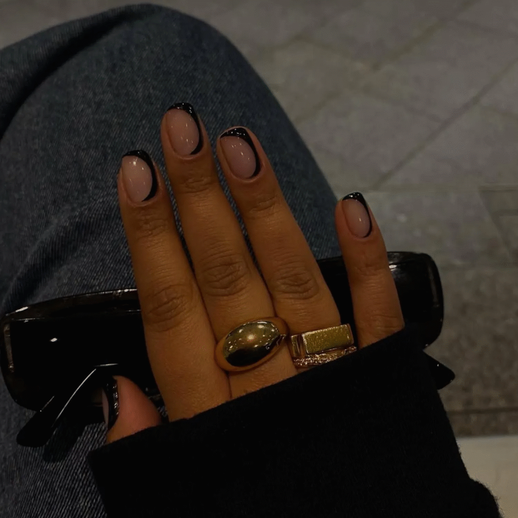 For a minimalist yet edgy look, try a half-moon design. Paint the curved side of your nails with a bold fall color like black, creating negative space for a chic and modern manicure. It’s simple, yet still makes a statement!