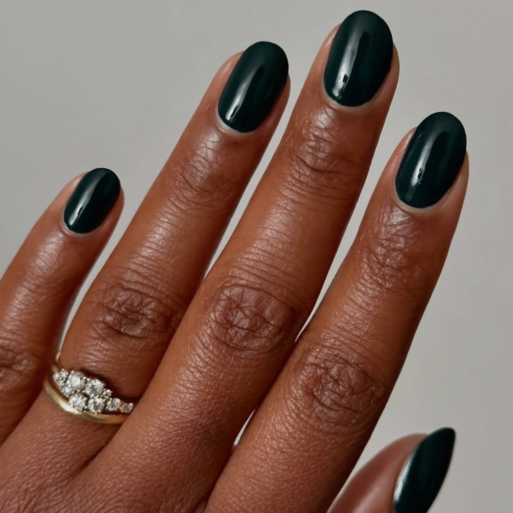 Emerald green nails are a perfect match for fall, evoking the earthy tones of the season. This elegant shade works beautifully on short nails, adding a touch of sophistication and nature-inspired beauty to your fingertips.