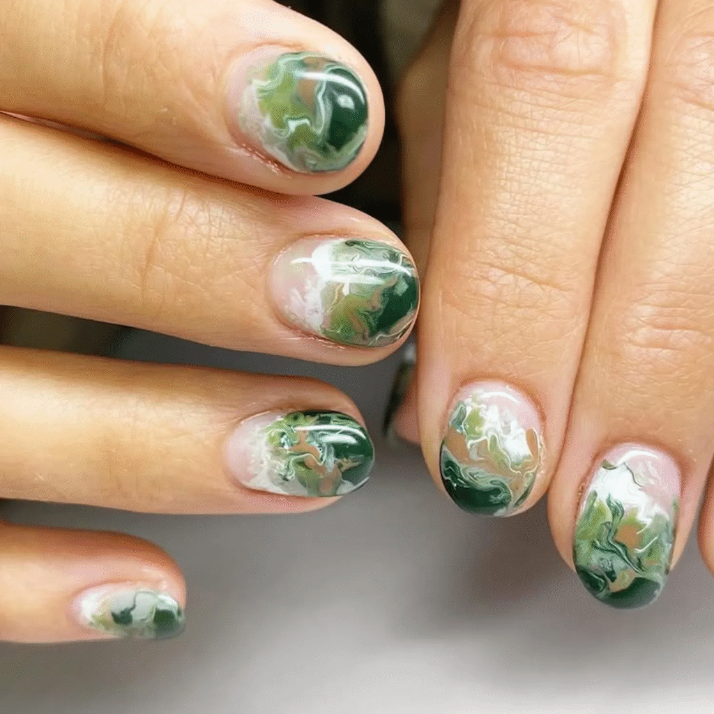 A marble design is a great way to bring the colors of fall into your manicure. This forest-inspired marbling of green, white, and brown creates a natural, earthy feel. It’s a stylish and unique way to showcase autumn’s beauty on your nails.