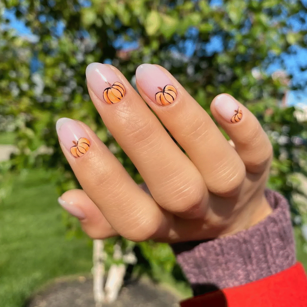 If you love all things Halloween or just can’t get enough of pumpkins, this manicure is for you. Little pumpkin designs at the base of your nails give your short nails a fun, festive touch. It’s a sweet and cute way to celebrate fall.