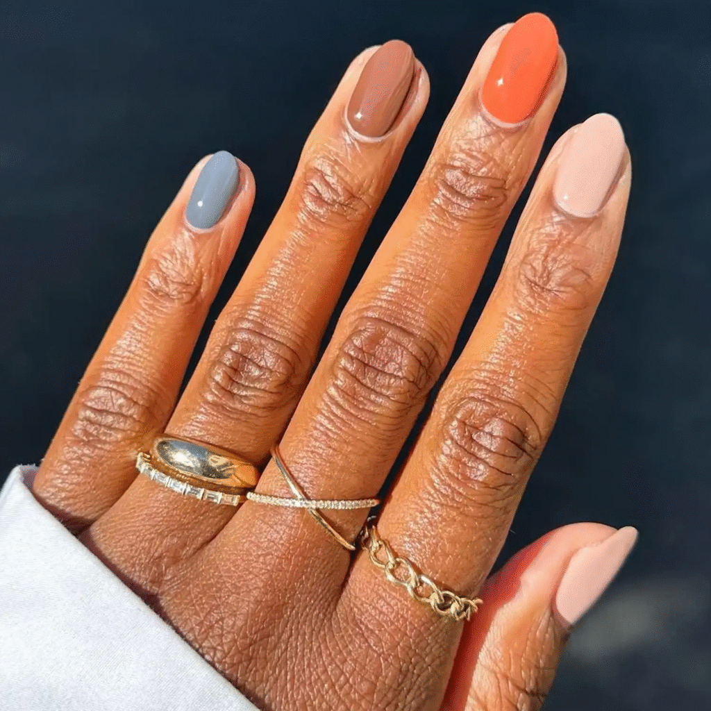 Pumpkin spice isn’t just for your latte—bring it to your fingertips too! This color-blocked manicure in warm autumn hues like orange and beige is the perfect way to show off your love for fall’s most popular flavor.