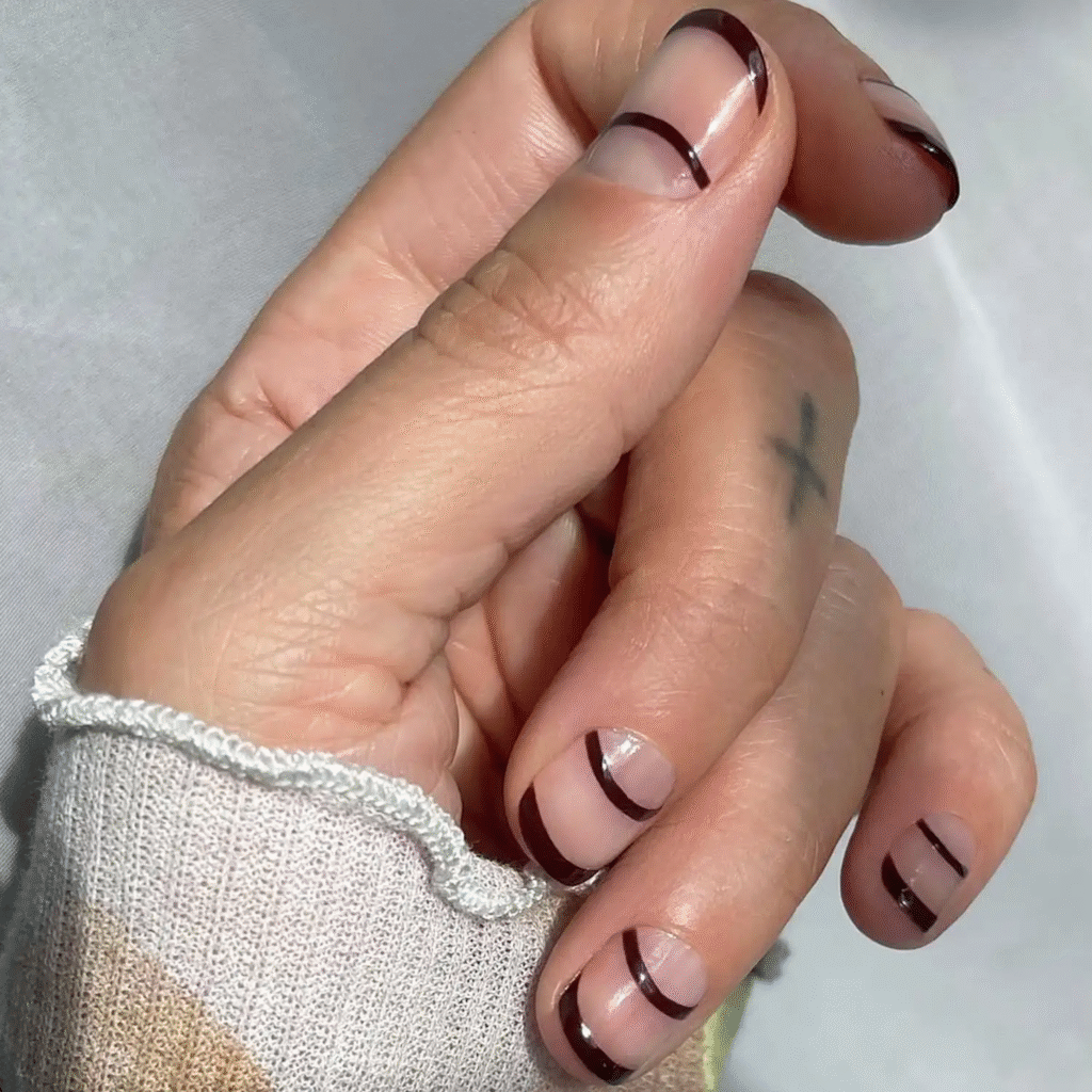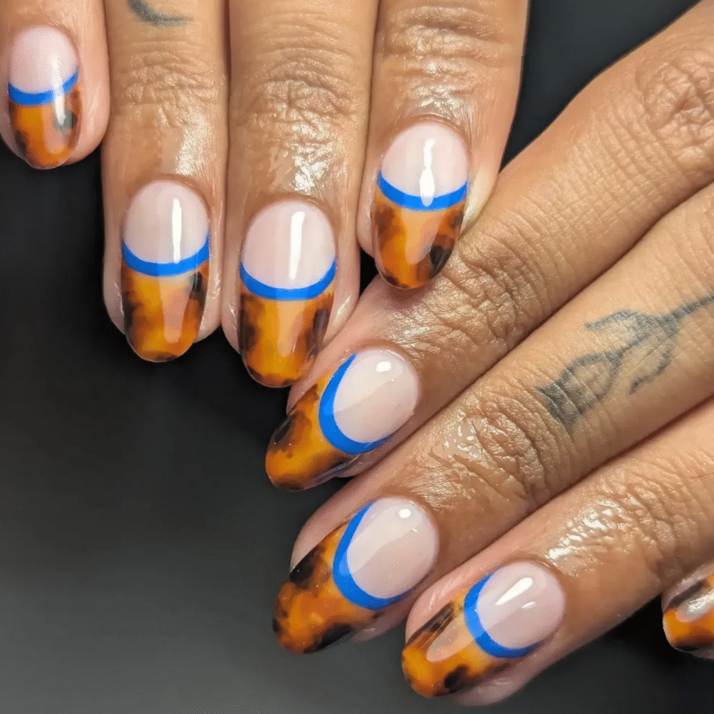 If you love the tortoise shell pattern but want something more subtle, try tortie tips with a deep French manicure. This look makes your short nails appear longer while still showcasing the classic tortoiseshell design. It’s a sophisticated way to embrace fall without overdoing it.
