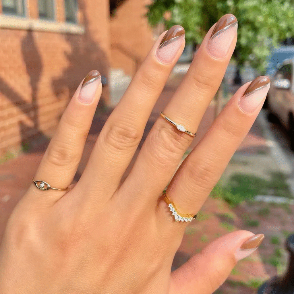 A little milk chocolate goes a long way for fall! These rich, warm tips look gorgeous on short nails. Add a shiny chrome line diagonally across each nail to give your manicure an extra touch of glam.