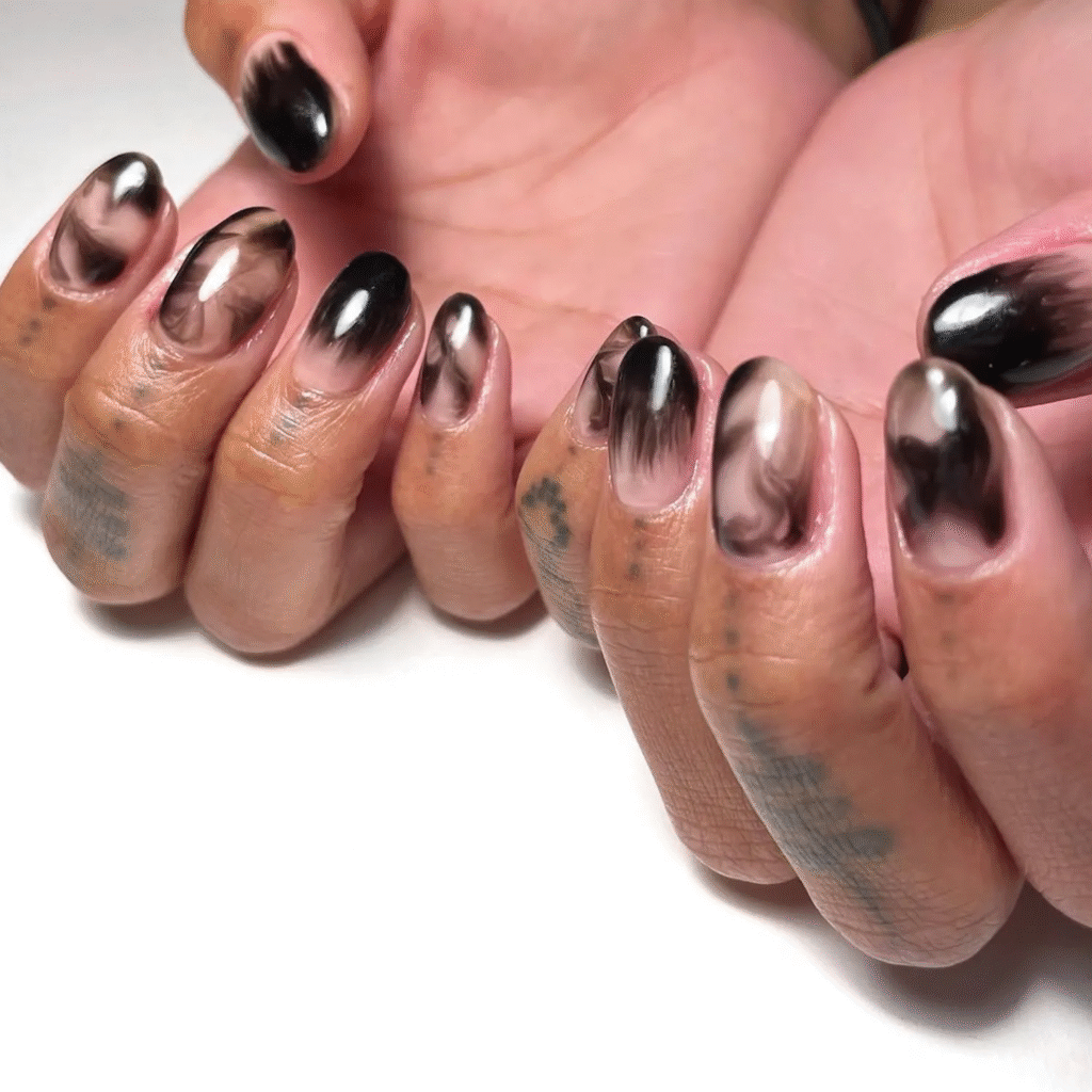 Dark, smoky nails are perfect for fall’s chilly nights. Black polish with a smoky effect gives off a moody, gothic vibe that pairs perfectly with the season’s atmosphere. You can always opt for a lighter smoky color for a subtler look.