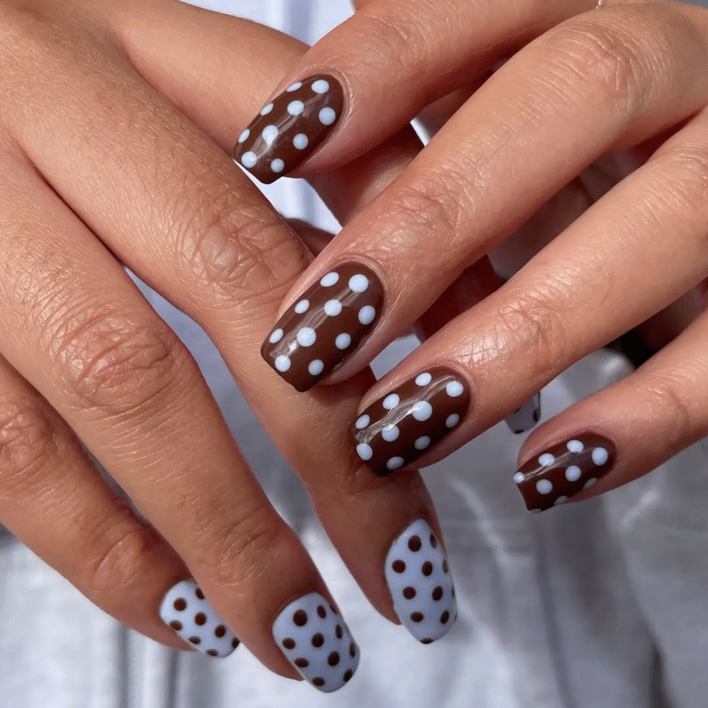Polka dots are everywhere this season! Combine a cozy brown shade with playful blue dots for a fun, mismatched look. The best part? This cute design looks amazing on short nails, so you can rock it without needing long lengths.