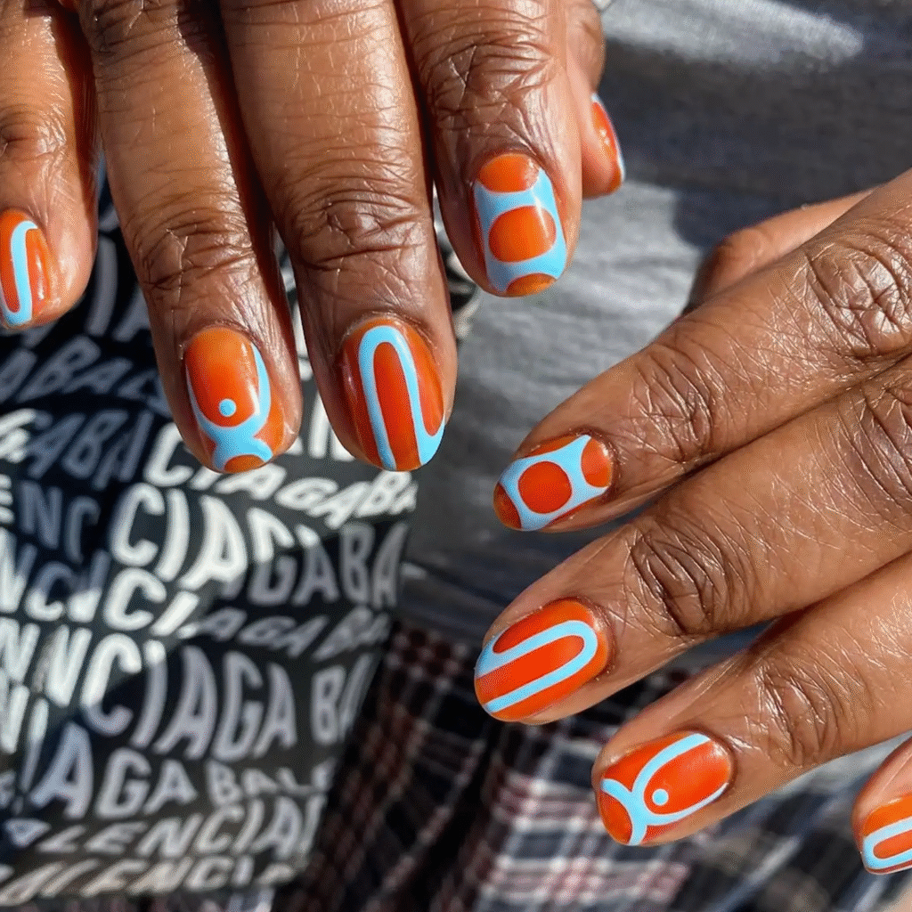 Fall is all about warm, rich tones, and burnt orange is a classic choice. For a whimsical twist, pair it with a hint of sky blue to add a pop of color. This toasty orange design brings all the autumn feels to your nails.