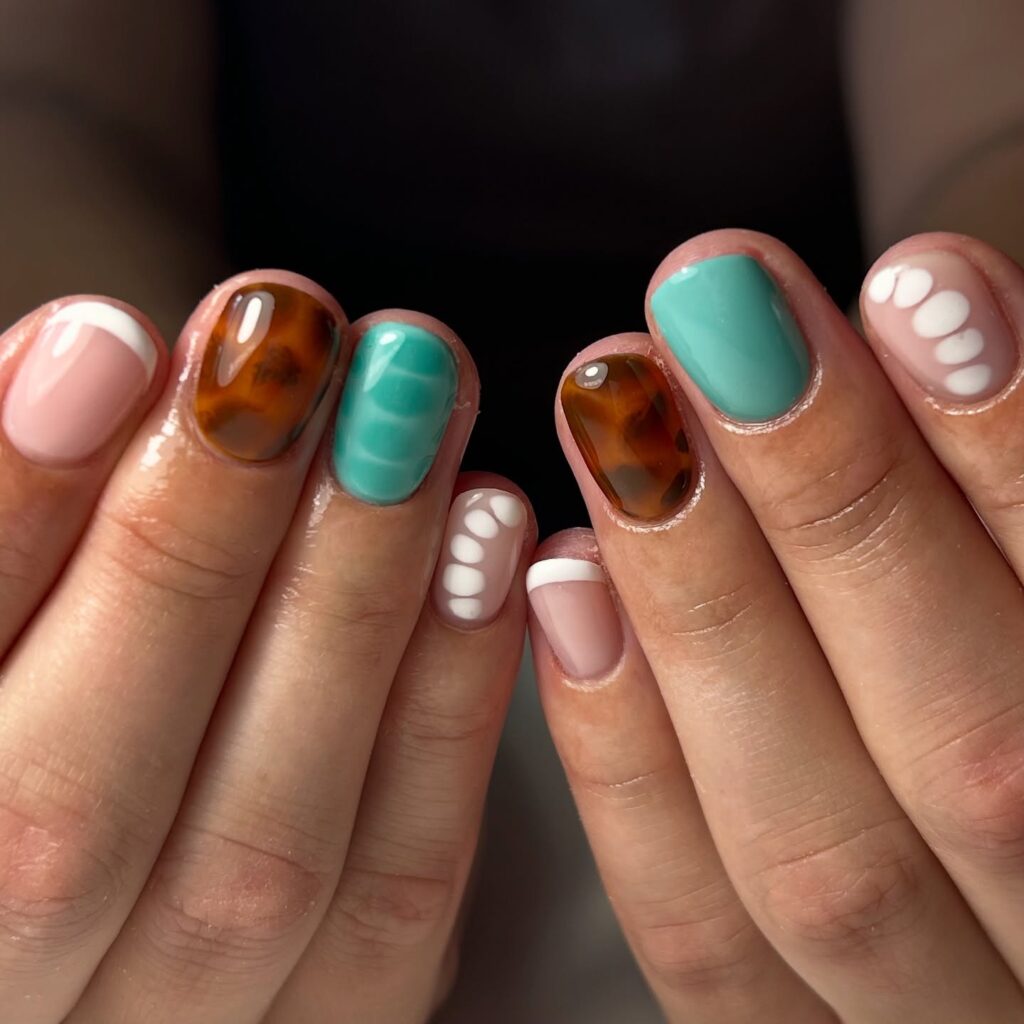 This vibrant nail art features a mix of soft pastels and bold patterns, creating a lively yet balanced look. The design includes unique touches like tortoiseshell patterns, mint green, and playful white accents, with a combination of glossy and matte finishes. Perfect for those who love experimenting with colors and textures!