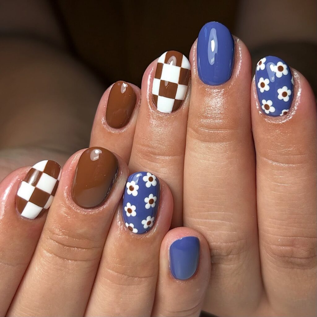 Playful and trendy nail design features a mix of bold, earthy tones and soft florals. The checkered pattern paired with floral accents creates a fun, vintage-inspired aesthetic, while the smooth, glossy finishes add a modern touch. A great choice for a bold yet cheerful nail look!
