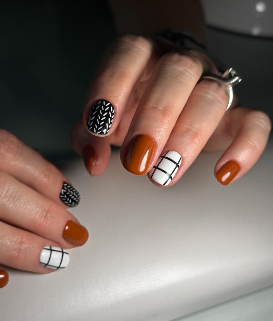 This nail design combines rich warm tones with bold patterns. Featuring a mix of glossy brown nails and black-and-white geometric details, it creates a perfect blend of sophistication and modern flair. The unique designs on each nail add an artistic touch, ideal for fall fashion.