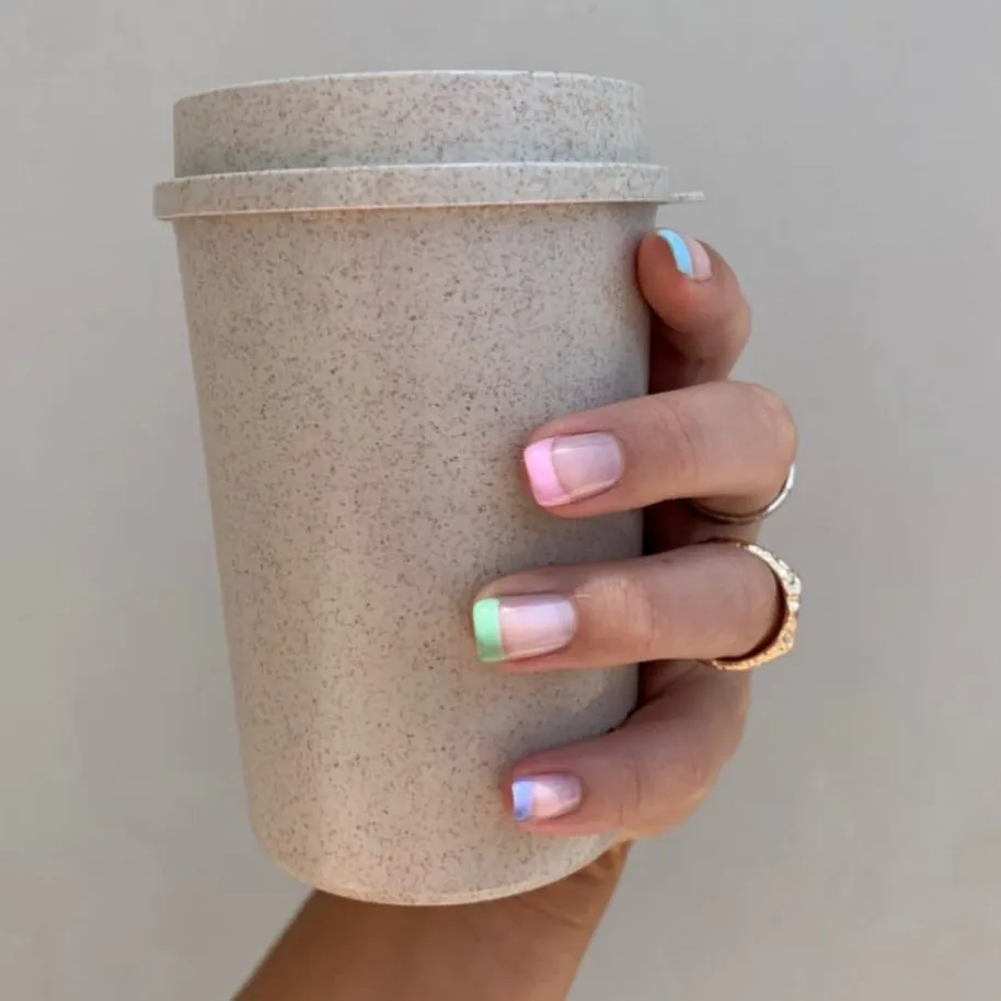 Why settle for a single color when you can go for multi-colored French tips? This design adds a playful twist to the classic French manicure. The pastel hues are perfect for the summer months, and the shorter square shape is the ideal base for this lively look.
