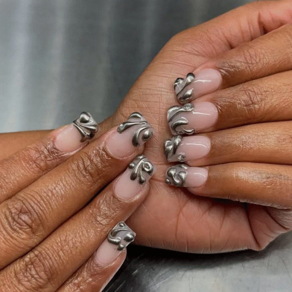 For a touch of luxury, try an ornate silver design. The metallic polish with 3D textures makes this a statement-making look. The square nail shape perfectly complements the sophisticated style, giving your hands a chic, polished finish.
