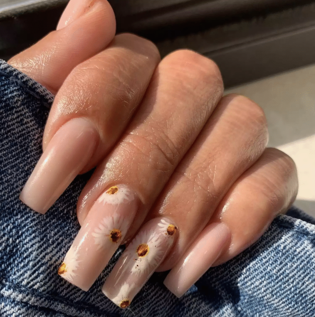 Floral designs are always a great way to brighten up your nails, and they look especially cute on square nails. These nude nails with sunflower art are simple, cheerful, and perfect for the warmer months. The soft colors keep it subtle, but the flowers add a lovely touch of fun.