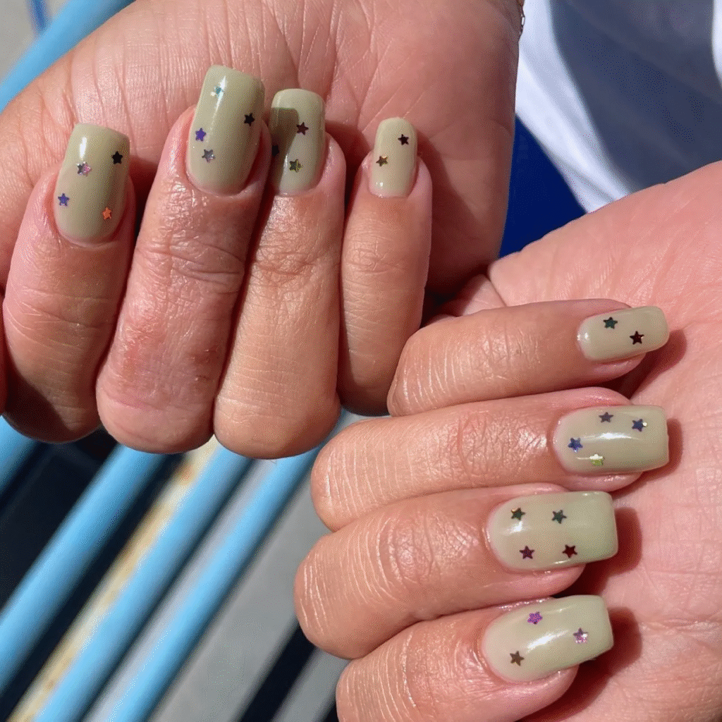For a little magic, try glow-in-the-dark nails. This green design, paired with tiny iridescent stars, gives off a cozy and whimsical vibe. Whether you’re at a party or just chilling at home, these nails will always have a special glow that lights up the night.
