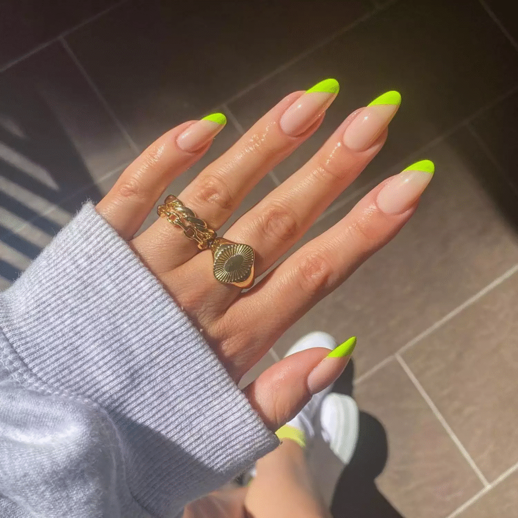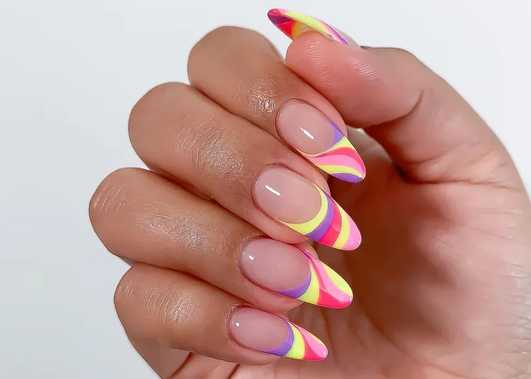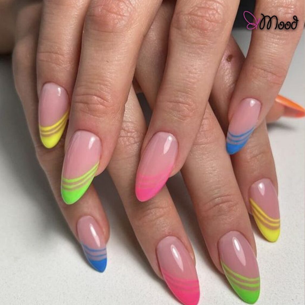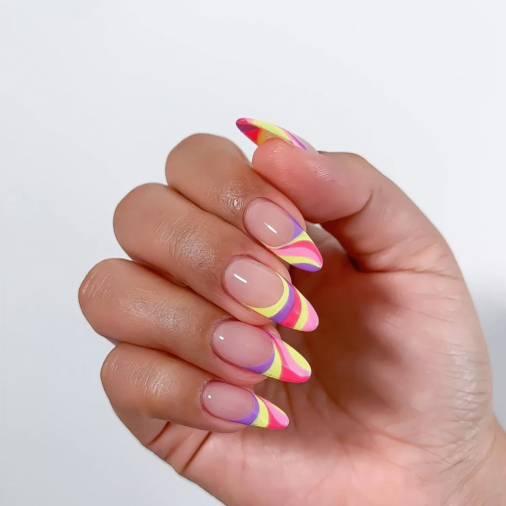 Vibrant neon French tips with curved gradient lines for a bold, playful look.