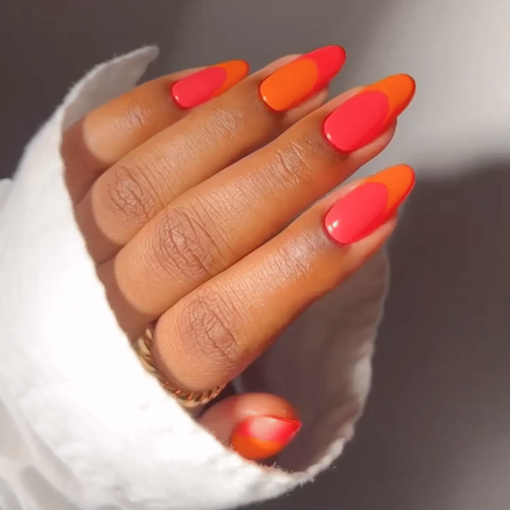 If you want a manicure that screams summer, try two-tone spritz tips. A bright reddish-orange tip paired with a juicy orange base gives off those refreshing cocktail vibes. You can switch things up by alternating the colors on each nail for an even bolder look. This one is guaranteed to catch eyes at any summer gathering!