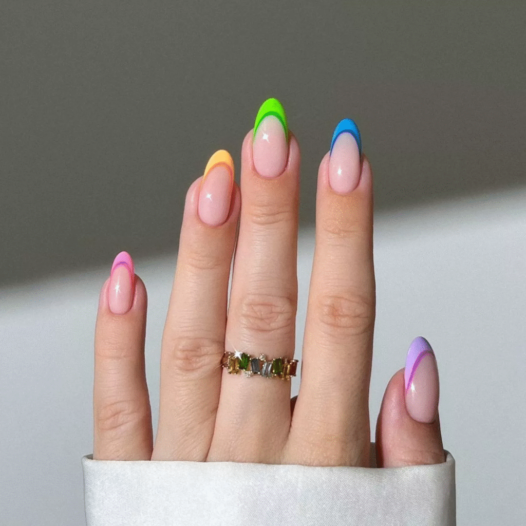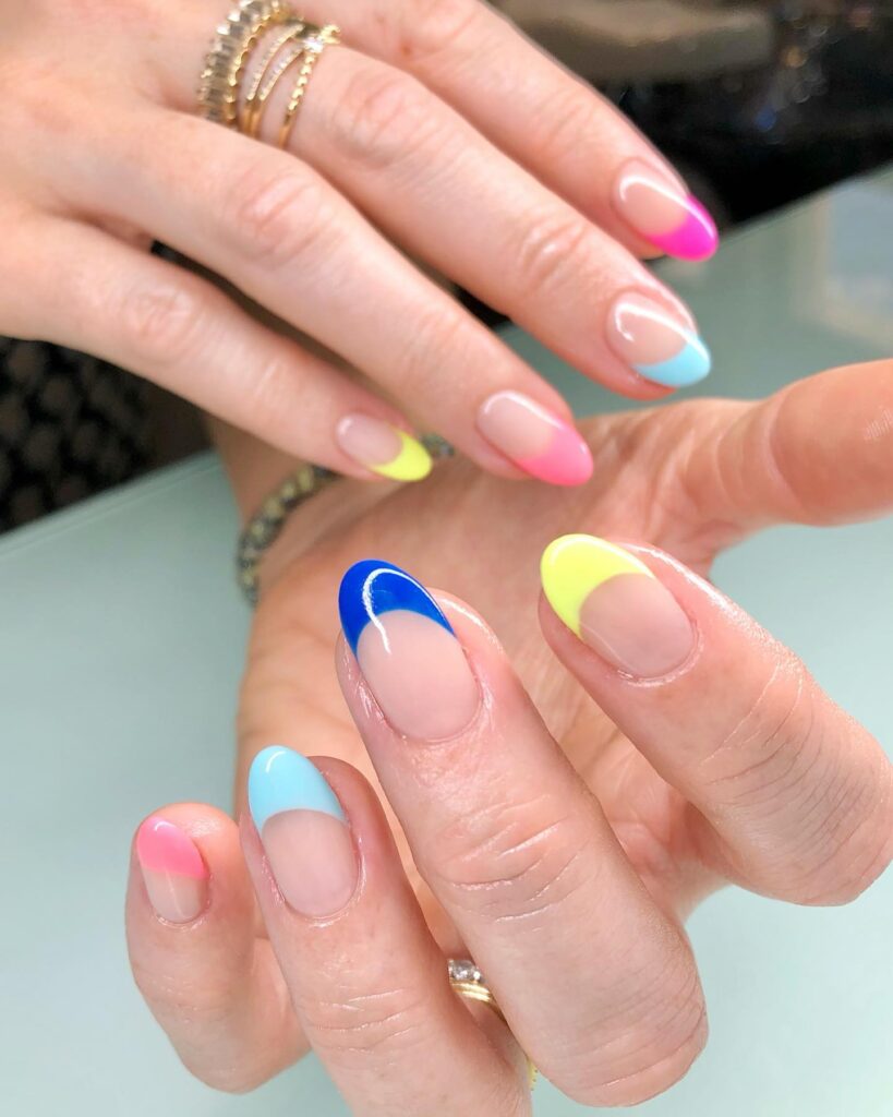 This playful nail design features a chic twist on the classic French tip, with each nail adorned in a vibrant gradient of colors. From neon pink and yellow to calming blue, the bold colors pop against a natural nude base, creating a fun and lively look perfect for any season. The rounded tips add a soft, elegant touch to the overall design.