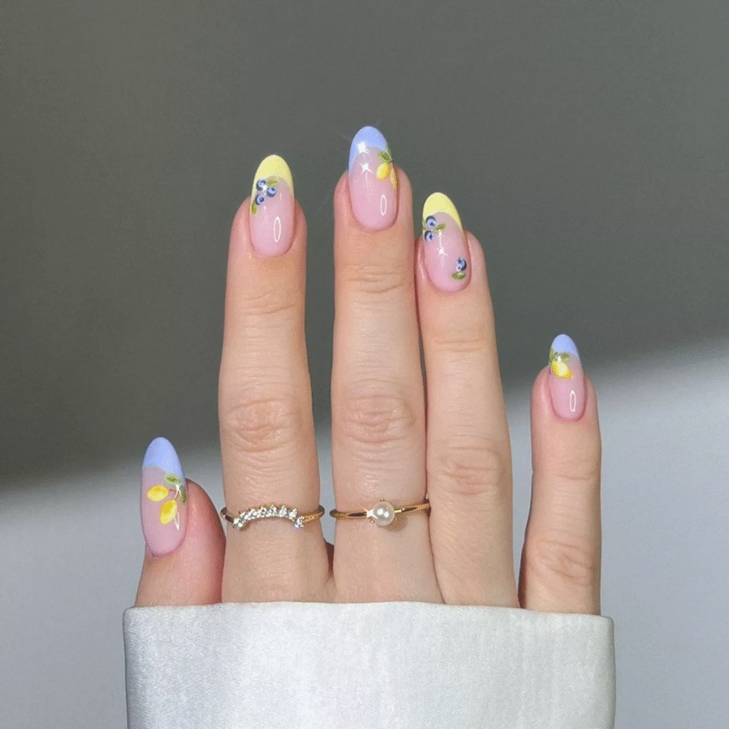 Who doesn’t love a cool, refreshing drink in the summer? This blueberry lemonade-inspired French manicure combines pastel blue and soft yellow tips for a sweet and sunny look. You can even add tiny fruit nail art like lemons and blueberries to make it feel extra refreshing.