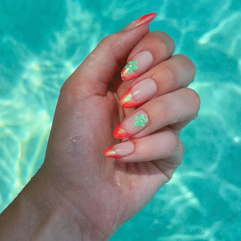 If you’re all about a shimmering summer vibe, coral shimmer French tips are perfect for you. The mint green flower accents add a fresh touch and create a stunning contrast against the coral tips. This is a playful yet elegant option that feels perfect for a summer evening.
