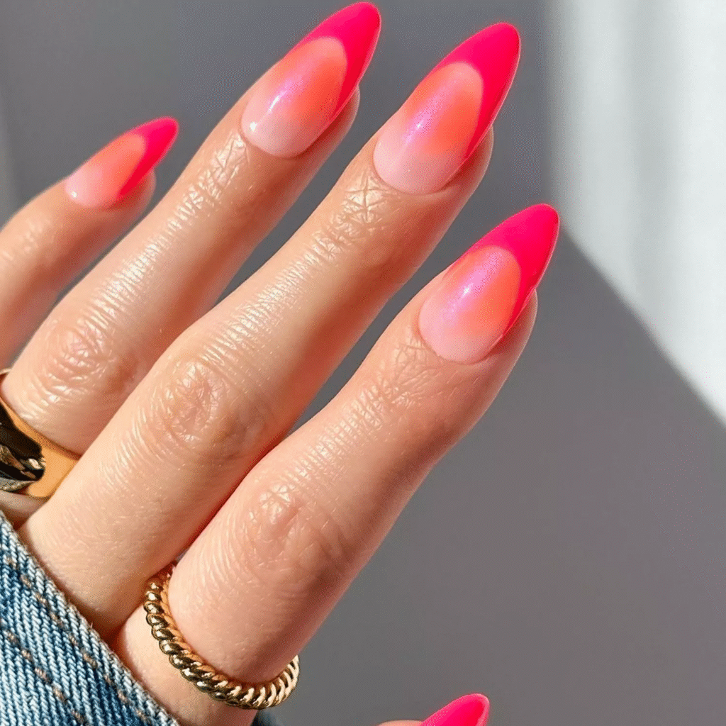Hot pink is a classic summer color, and it works beautifully in a French manicure. Pair it with a peachy-orange base for a tropical, beachy feel. This combination is fun, vibrant, and perfect for those who love standing out with bold, colorful nails.