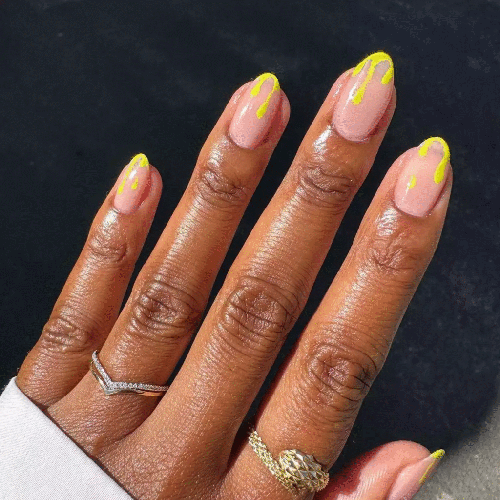 There’s no better way to beat the summer heat than with ice cream! This fun French manicure mimics a melting ice cream cone, using a drip effect with neon yellow polish. It’s a playful and sweet look that will have everyone craving a treat.