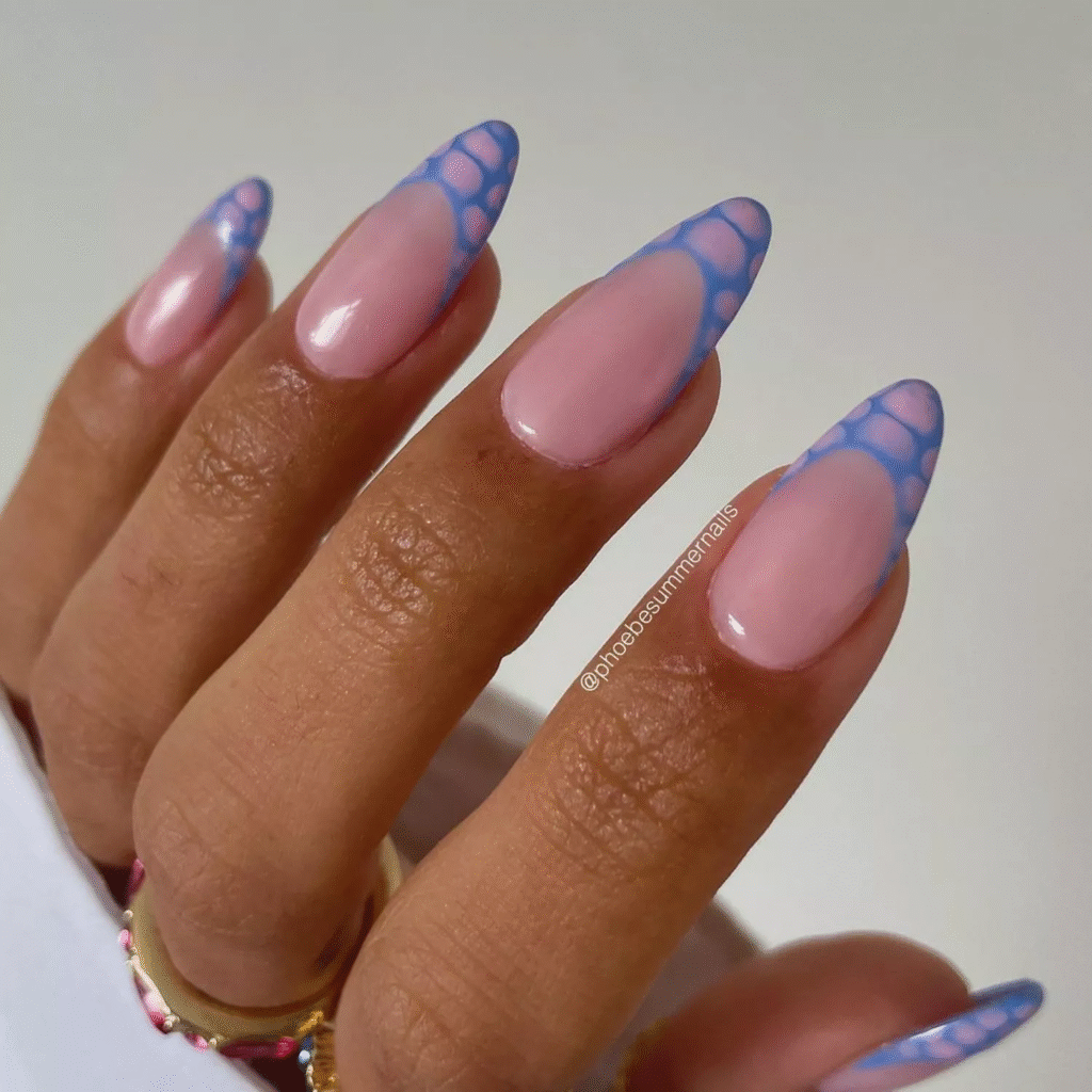 For a chic and trendy twist, try periwinkle snakeskin tips. Snakeskin is a popular pattern right now, and these periwinkle tips give it a soft and sophisticated look. The sheer pink base adds a polished, elegant finish to this design, making it perfect for any fashion-forward woman.