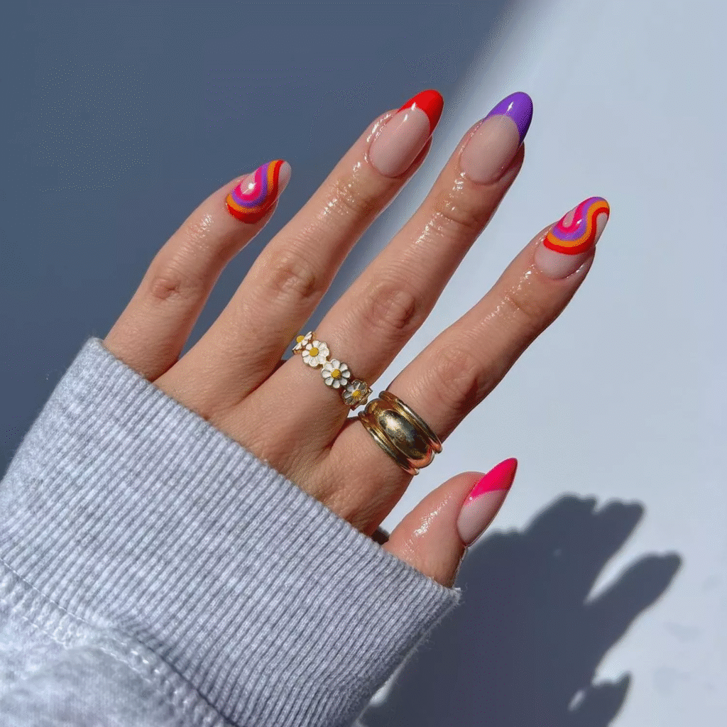 A groovy swirl French manicure is perfect for those who love bold, retro designs. With swirling patterns in pink, orange, and purple, this design adds a fun wave of color to your nails. It’s a playful and unique take on the classic French tips and is sure to make a statement.