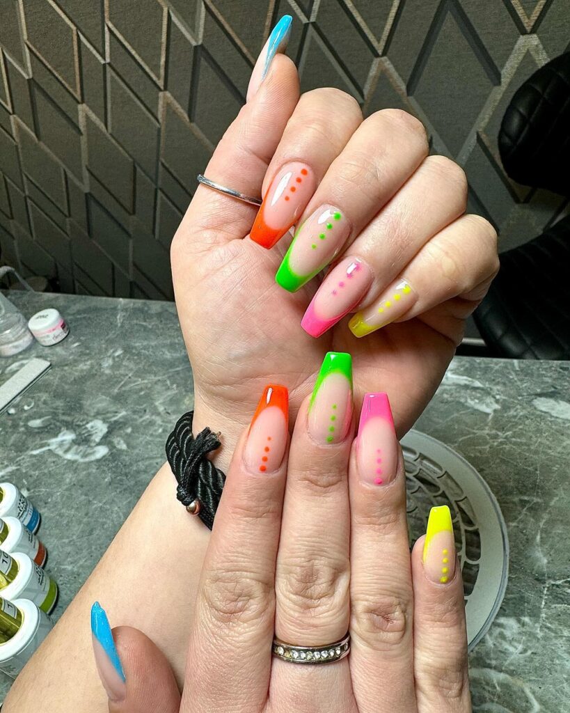Bold neon gradients with dotted accents on square tips, creating a fun and vibrant nail look.