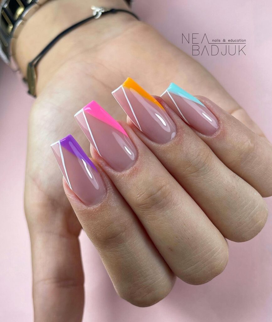 These nails showcase a stylish twist on the classic French manicure, with sleek square tips and a vibrant gradient of purple, orange, and teal hues. The sharp, geometric lines are complemented by a clean, neutral base, creating a modern and eye-catching design perfect for any occasion.