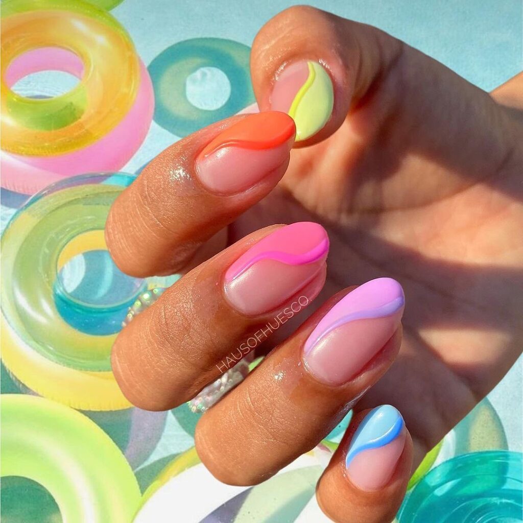 Soft pastel wavy lines in orange, yellow, pink, and blue grace the tips of these nails, creating a playful and refreshing look. The smooth curves add a modern twist to the classic French manicure.
