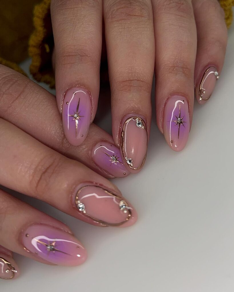These delicate nails feature a soft gradient from nude to lavender, adorned with gold accents and star details. The addition of small rhinestones adds a touch of elegance, making this manicure both subtle and sophisticated.