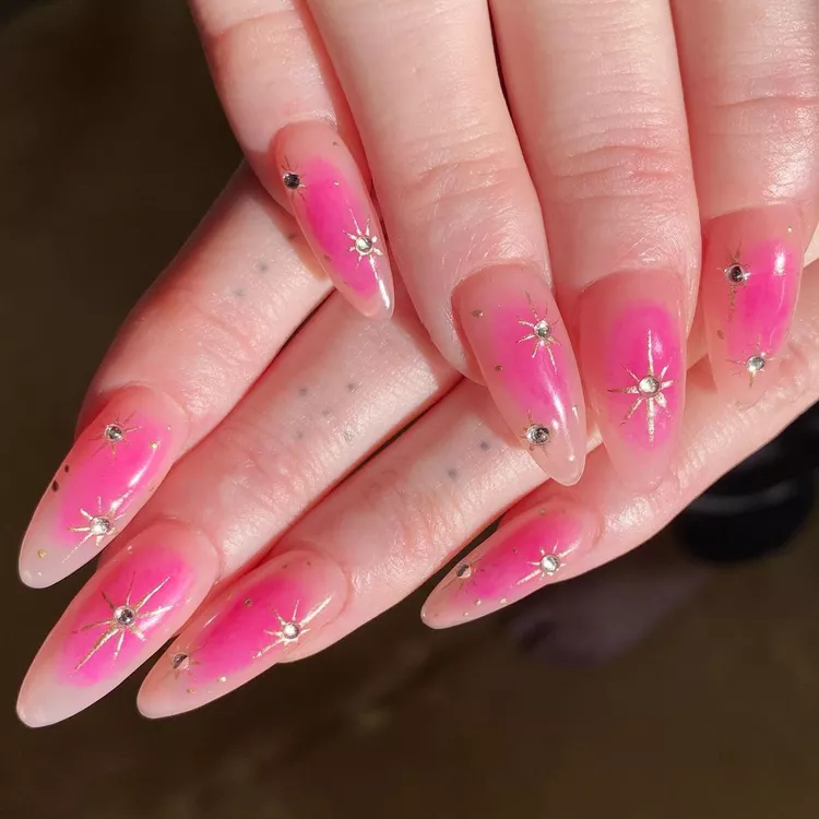 Bright neon pink in the center of a nude nail creates a glowing, energetic look, enhanced with silver stars and sparkles for a celestial finish.