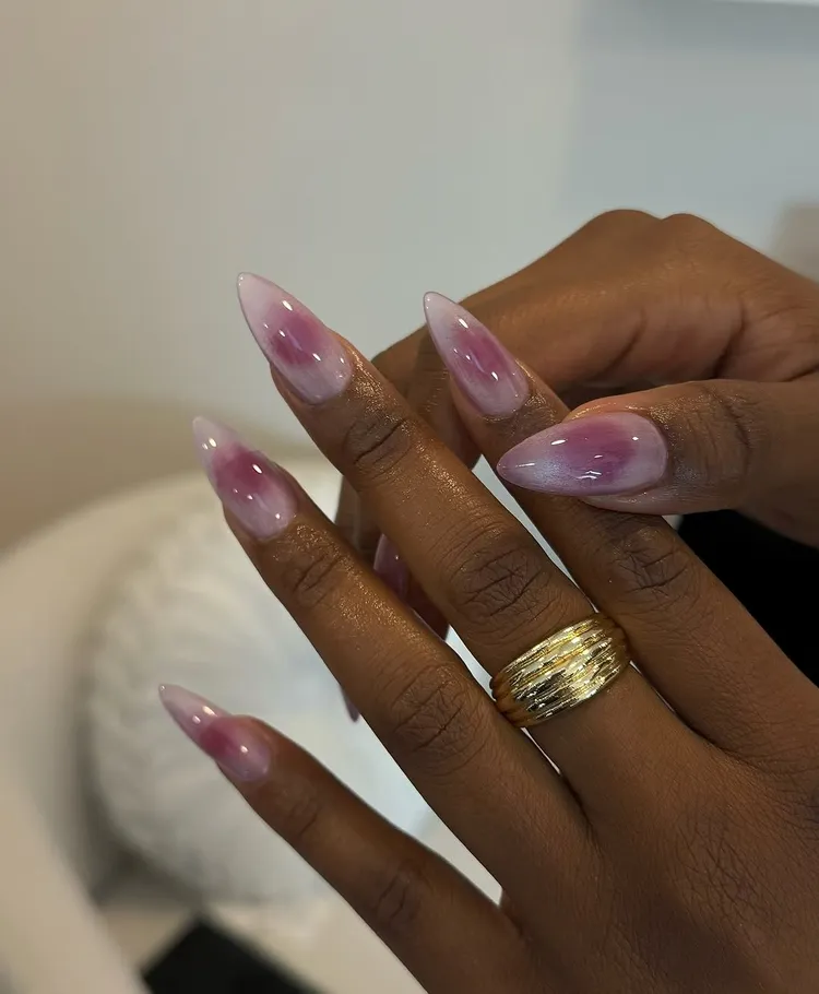 A dreamy lavender and bright pink gradient creates a serene, complementary aura effect on your nails.