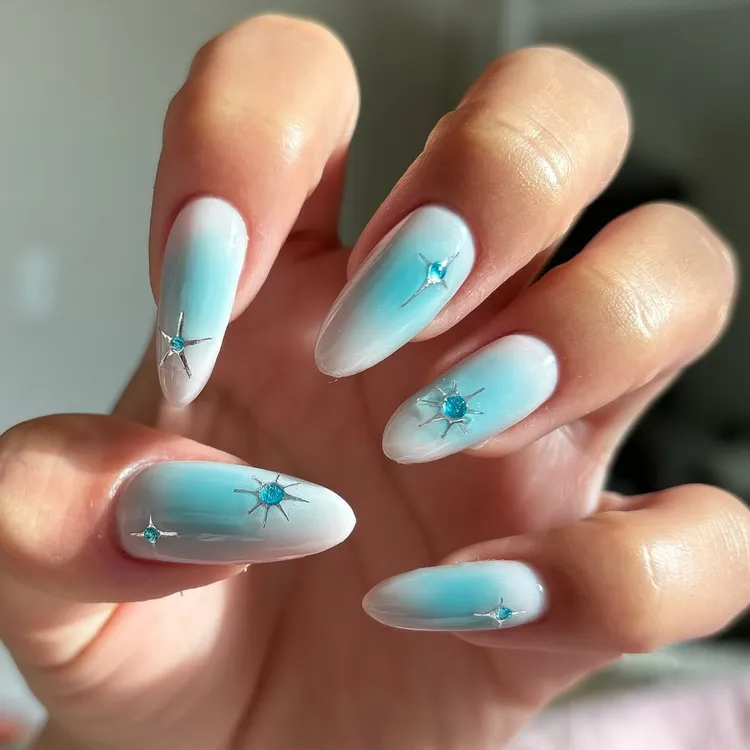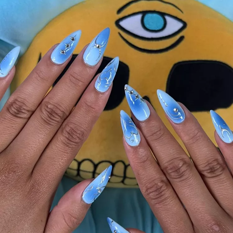 This stunning design pairs a white-to-blue aura with star decals for a night-sky effect that’s both delicate and bold.