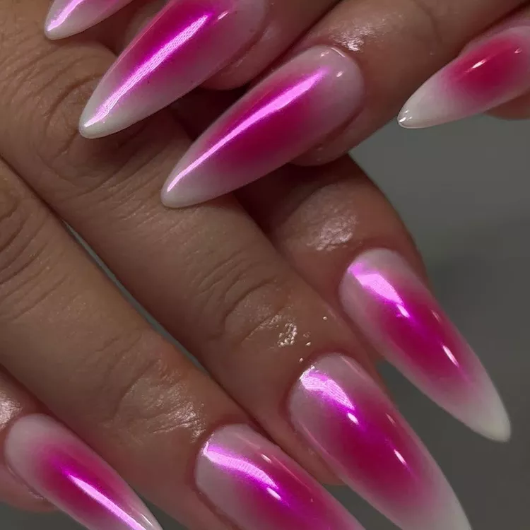 The shimmer of chrome pink, set against a milky white base, gives your aura nails a bold yet ethereal finish.
