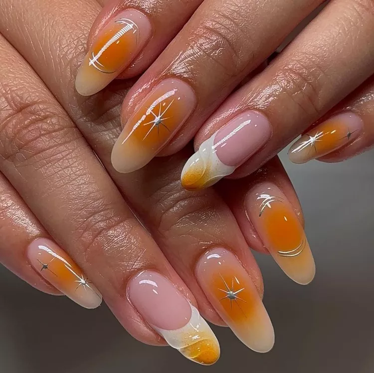 Get playful with vibrant orange aura accents, perfect for a fresh, summery look with a pop of sparkle.
