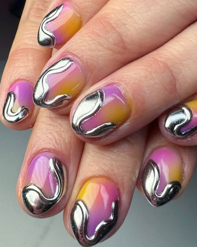 A vibrant pink and yellow gradient with sleek metallic silver accents creates a fluid, wave-like effect, making this manicure bold and stylish.