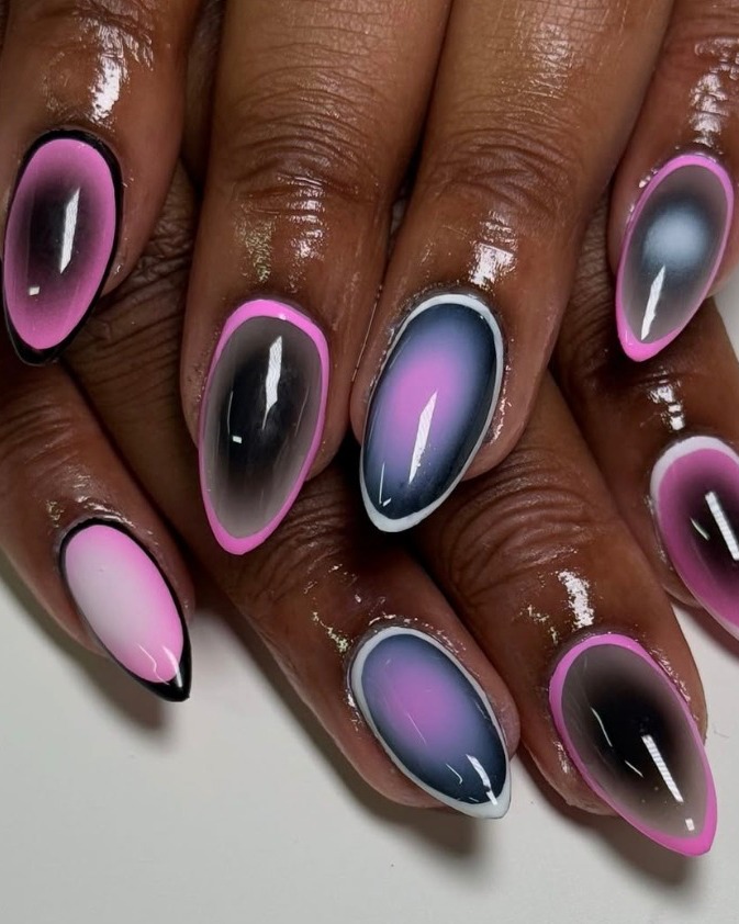 These stunning nails feature a smooth ombre gradient in shades of black, pink, and white, with a bold neon pink outline creating a striking contrast. The sharp, glossy finish and elongated almond shape add to the futuristic, edgy appeal of this chic manicure.