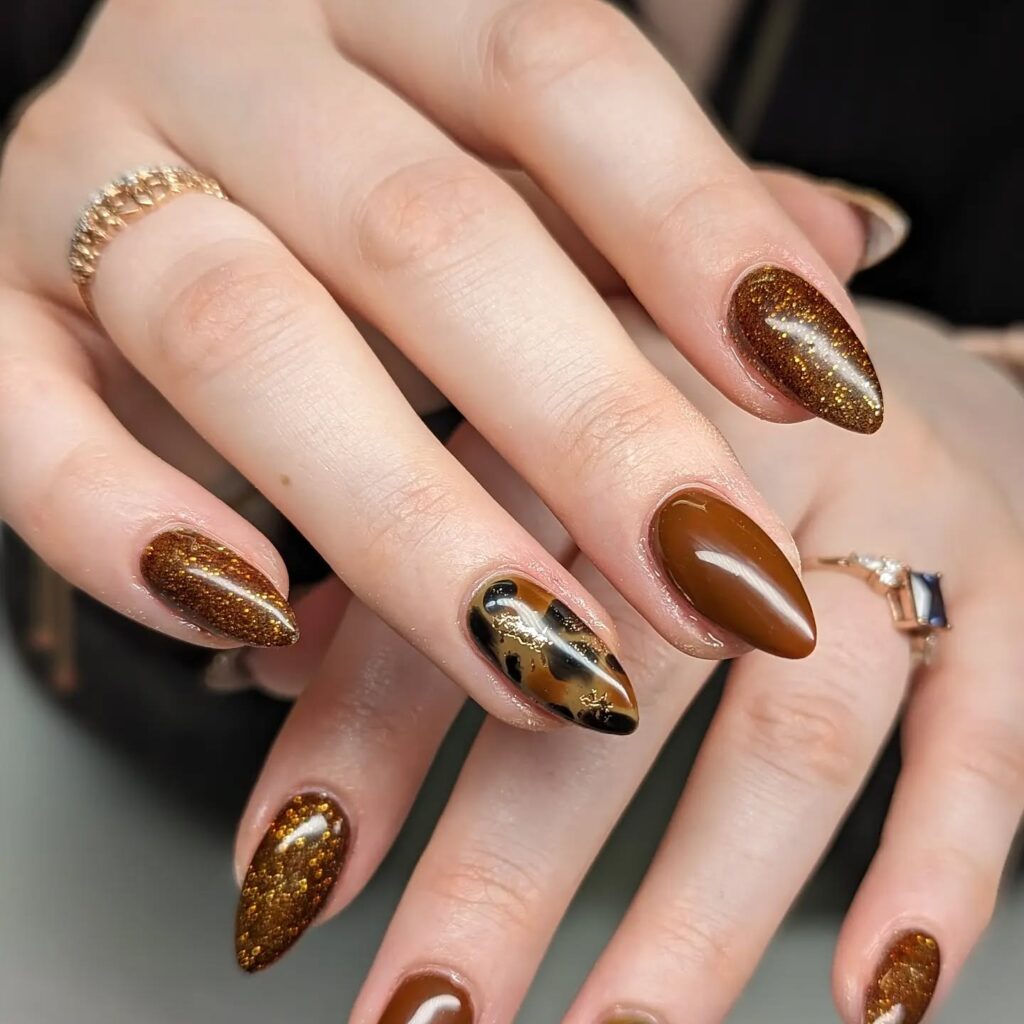 A chic combination of glossy browns, sparkling glitter, and a marble accent, perfect for a sophisticated yet trendy look.